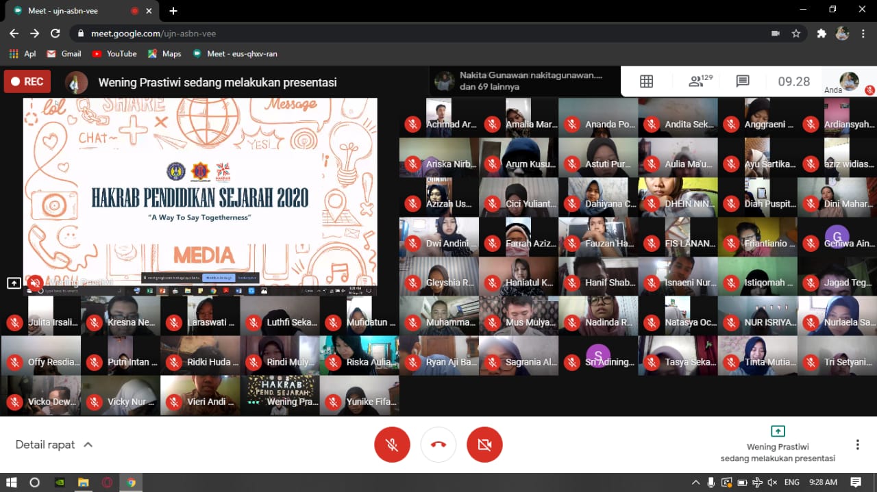Covid-19 yang kasusnya semakin hari semakin tinggi sepertinya tidak menyurutkan semangat dari teman-teman panitia dan mahasiswa yang terlihat antusias untuk mengikuti acara Hari Keakraban (Hakrab) 2020 yang dilaksanakan oleh Himpunan Mahasiswa Pendidikan Sejarah (HMPS) FIS UNY. Hari Keakraban atau Hakrab adalah acara rutin yang dilakukan untuk mengakrabkan mahasiswa baru pendidikan sejarah dengan sesama mahasiswa baru, namun juga mengakrabkan mereka dengan para kakak tingkat dan alumni dan juga agar mahasiswa baru mengenal lebih dalam dengan keluarga HMPS FIS UNY. Acara Hakrab pada tahun ini sangat berbeda pelaksanaannya dengan Hakrab tahun lalu dikarenakan adanya pandemi Covid-19, acara Hakrab pada tahun ini terpaksa dilakukan secara online yang dilangsungkan via Google Meet pada tanggal 19 dan 20 November 2020 kemarin. Pembagian acara menjadi 2 hari dimaksudkan untuk mengurangi rangkaian acara yang ada, dan juga panitia juga memperhatikan kondisi mahasiswa baru agar tidak harus menatap layar gadgetnya dari pagi hari hingga malam dan pemilihan hari yang bertepatan dengan hari Sabtu dan Minggu karena dianggap pada hari tersebut para peserta tidak terlalu sibuk. Pada tahun ini Hari Keakraban bertajuk “A Way To Say Togetherness” mengusung tema kebersamaan dan kekeluargaan yang merupakan kultur dari Pendidikan Sejarah sendiri, Hakrab pada tahun ini memiliki tujuan untuk menujukkan bahwa mahasiswa Pendidikan Sejarah dapat tetap bersama walau dalam kondisi pandemi sekarang ini.