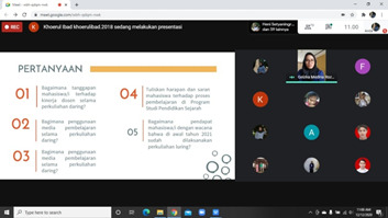 Pelaksanaan kegiatan diskusi akademik #2 berlangsung pada hari Sabtu, 12 Desember 2020. Kegiatan tersebut berlangsung dari pukul 10.30 – 13.00 WIB melalui Google Meet. Kegiatan diskusi akademik dipandu oleh Tegar Ristianto selaku MC, Alen Sanjaya selaku moderator, serta Dr. Zulkarnain., M.Pd selaku pemateri. Kegiatan diskusi akademik yang di selenggarakan oleh Himpunan Mahasiswa Pendidikan Sejarah (HMPS) dihadiri oleh 70 orang peserta diskusi yang terdiri Bapak/Ibu Dosen Pendidikan Sejarah serta teman - teman mahasiswa/i Pendidkan sejarah. Berdasarkan diskusi yang telah dilaksanakan pada hari Sabtu, 12 Desember 2020 diperoleh hasil diskusi berupa masukan terhadap penggunaan media pembelajaran selama dilaksakannya perkuliahan daring, masukan dari teman – teman mahasiswa terhadap kinerja dosen, kendala yang dirasakan oleh mahasiswa serta dosen selama perkuliahan daring, dan penjelasan mengenai wacana perkuliahan luring yang disampaikan oleh Bapak/Ibu Dosen Pendidikan Sejarah kepada teman – teman mahasiswa. Dengan adanya pelaksanaan diskusi akademik ini, diharapkan dapat dijadikan sebagai tempat bertukar pikiran antara dosen dengan mahasiwa serta semoga permasalahan terkait perkuliahan yang sedang dihadapi saat ini dapat menemukan titik terang.